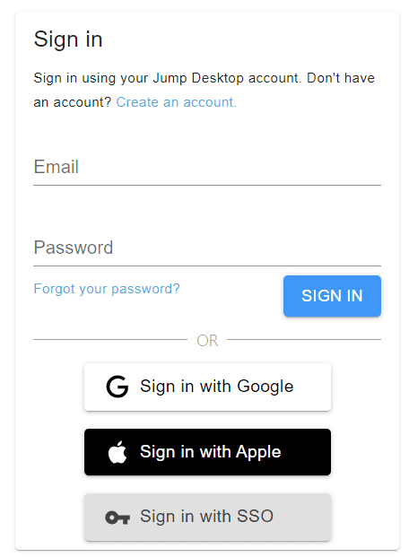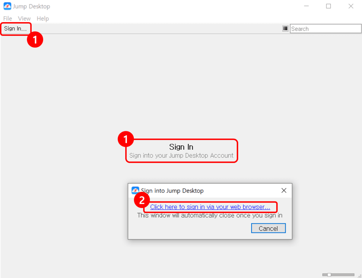 설치된 파일을 실행하게 되면 아래와 같이 화면이 표출됩니다. 점프 데스크탑은 로그인한 아이디를 통해 사용자가 제어할 컴퓨터를 식별하므로 Sing In을 클릭하여 로그인 화면으로 이동합니다.