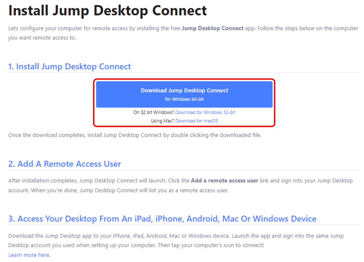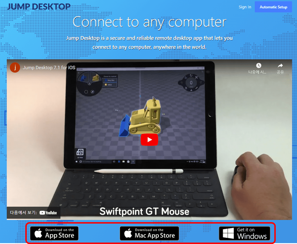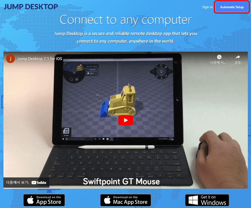 피제어 컴퓨터 프로그램은 JumpDesktopConnect라는 프로그램입니다. 제어 컴퓨터 프로그램은 이 프로그램이 설치되고 동일 아이디로 로그인된 컴퓨터를 피제어 컴퓨터로 인식합니다. 피제어 컴퓨터에서 점프 데스크탑의 홈페이지에 접속하고 오른쪽 상단의 Automatic Setup을 클릭하여 설치파일 다운로드 화면으로 이동합니다.