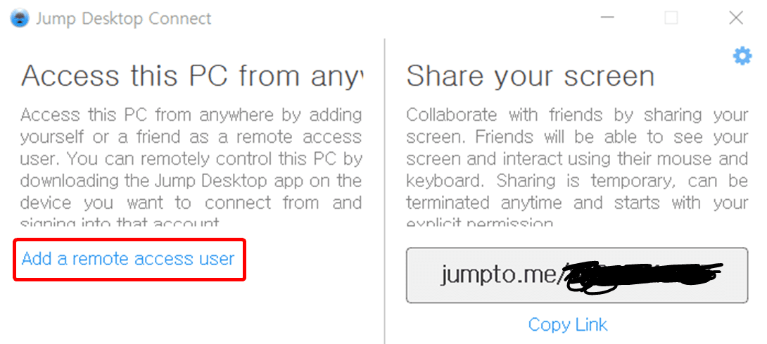 피제어 프로그램이 설치 완료된 후 실행하면 아래와 같은 화면이 표출됩니다. 제어 컴퓨터 프로그램이 피제어 컴퓨터를 인식하도록 하기 위해 Add a remote access user(원격 접속 사용자 추가)를 클릭합니다.