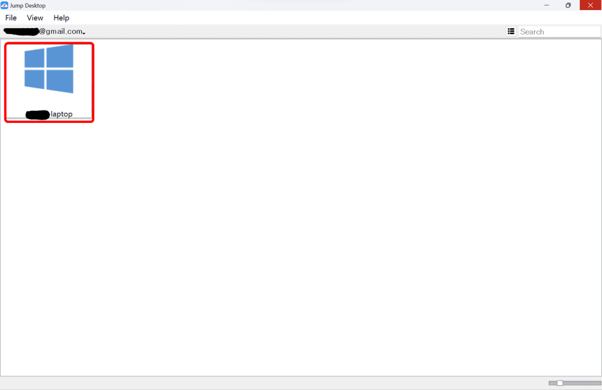 이제 원격 데스크톱 연결을 위한 모든 준비가 끝났습니다. 원격 접속을 수행해보도록 하겠습니다. 제어 컴퓨터에서 점프 데스크탑을 실행하게 되면 아래와 같이 피제어 컴퓨터를 인식하는 것을 보실 수 있습니다.