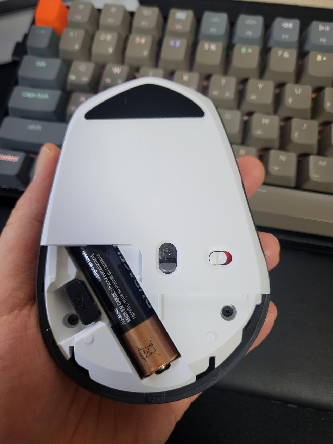 마우스 아랫면에는 전원 스위치가 있으며 하단의 커버를 탈거하면 건전지 삽입구가 나옵니다. 또한 건전지 옆에 유니파잉 수신기가 있는 것을 볼 수 있습니다. 마우스를 구매했을 때 건전지가 들어있지 않은 경우도 많은데 제공되어서 좋았으며, MX Vertical의 경우 유니파잉 수신기를 별도로 들고 다녀야 하는데 본 제품은 내부에 가지고 다닐 수 있게 되어 있어서 좋았습니다.