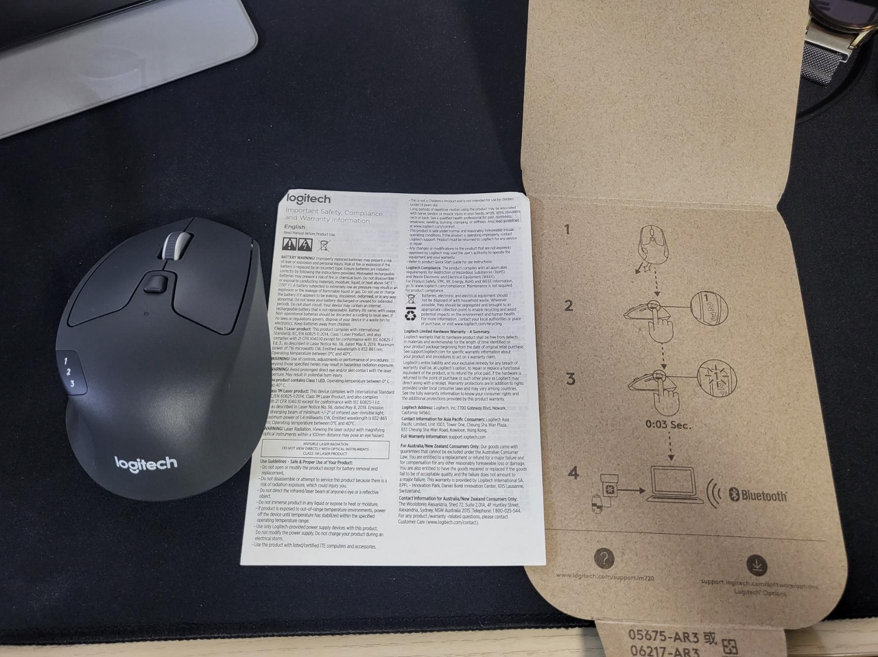 외적으로 보이는 기본 구성품은 로지텍 M720과 제품보증서로 보이는 종이가 있으며, 포장 종이에 연결 설명서가 적혀있습니다. 현재 사진에는 보이지 않지만 유니파잉 수신기(동글이)도 있으며, 위치는 아래에서 보여드리겠습니다.