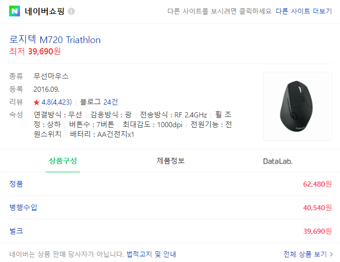 2023년 5월 21일 기준, 네이버 쇼핑을 확인해 보니 39,690원입니다. 개인적으로 마우스는 꼭 국내 정식발매 제품을 살 필요는 없다고 생각합니다. 주 마우스인 버티컬 마우스에 버튼 씹힘 현상이 발생해서 서비스 센터에 문의하니 소모품이기 때문에 수리가 되지 않는다고 하더군요. 그래서 어쩔 수 없이 사설 업체에서 수리했었습니다. 따라서 만약 저와 다르게 배송 속도보다 가격이 중요하시다면 네이버 쇼핑 이용 시 더욱 저렴하게 구매하실 수 있으니 참고하시기 바랍니다.