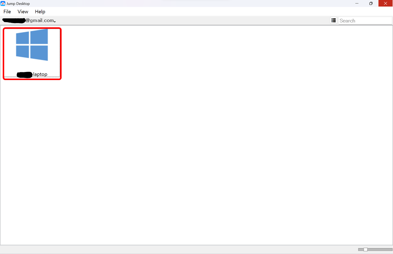 이제 원격 데스크톱 연결을 위한 모든 준비가 끝났습니다. 원격 접속을 수행해보도록 하겠습니다. 제어 컴퓨터에서 점프 데스크탑을 실행하게 되면 아래와 같이 피제어 컴퓨터를 인식하는 것을 보실 수 있습니다.