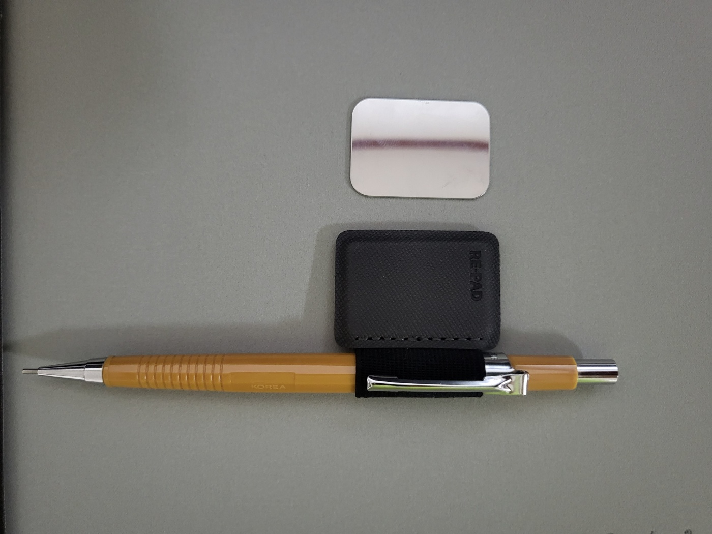 저는 샤프를 주로 사용하기 때문에 펜 홀더에 부착해 봤습니다. 펜을 끼웠을 때의 모습 참고가 되셨으면 좋겠습니다. 펜 홀더 또한 자석으로 되어있어서 리패드 위나 아래에 붙이고 다니는 용도로 사용하실 수 있습니다.