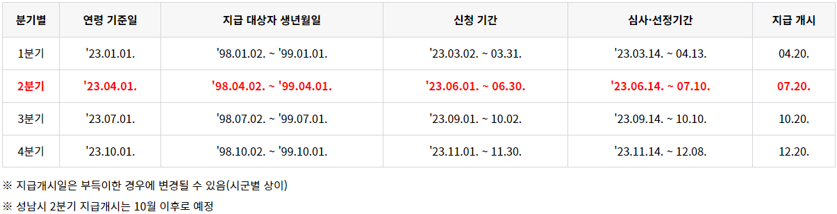 지급대상은 신청일 기준 경기도에 주민등록을 두고 있는 청년 즉, 경기도에서 3년 이상 계속 또는 합산 10년 이상 거주 중인 만 24세 청년을 대상으로 합니다. 이번 2분기에는 1998년 4월 2일부터 1999년 4월 1일 내 출생자에 해당한다면 신청 가능한데요. 생년월일에 따라 신청가능한 분기가 다르니 위의 표를 확인하시기 바랍니다.
