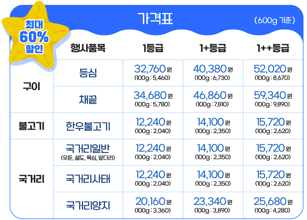 이번 행사에는 전남의 녹색한우, 농협안심한우, 경북의 안동비프, 울산의 울산축협한우, 전남의 지리산순한한우, 경북의 참품한우, 충남의 토바우, 경북의 경북대구한우 한우왕, 강원도의 홍천한우 등 총 9개의 브랜드가 참여하였습니다. 행사품목과 등급에 따라 가격 차이는 있으며 최대 60%까지 할인한다고 합니다.